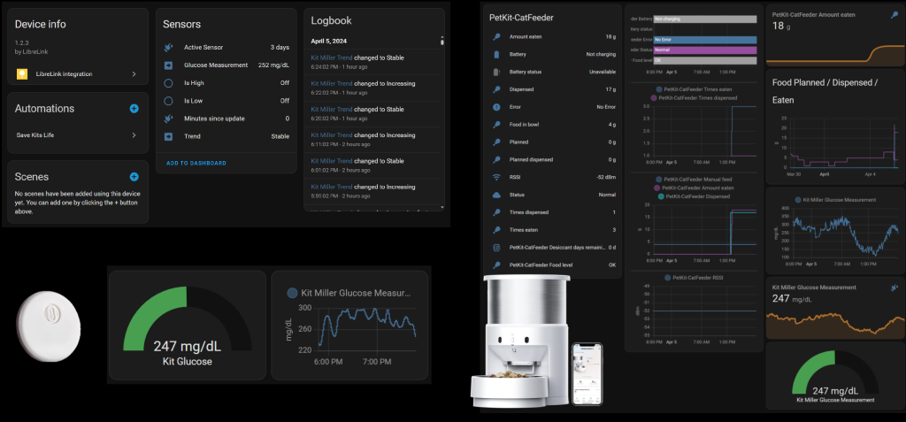I took this as a challenge. Integrate the CGM within my smart home, to ensure I had real-time feedback over the 2 weeks each sensor provides. Automate any situation where problems may arise. Luckily integrations exist for both Freestyle Libre CGM, and my PetKit smart dry feeder. I was able to pull in the sensor, the feeder, and create an automation that announces when blood sugar is getting low, to drop food and spike the numbers. This meant reading the bluetooth low energy signal from the CGM, using the bluetooth proxy network easily covering the entire loft.
