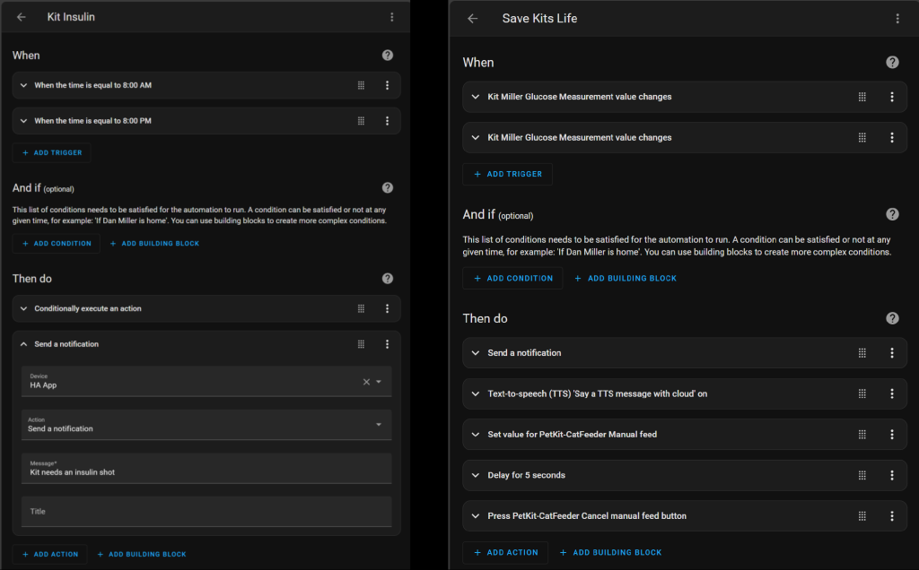 I also created notifications to remind me when to give a shot, as the Lantus Solostar pen, filled with Glargine U100, is designed to cover him for 12 hours per injection. These are announced across the loft, but also sent as a push notification to my phone. I have since added complexity to remove these notifications once i apply insulin, to ensure i don’t forget and apply a second shot a few hours later, doubling the dose. As this would be a fatal error.