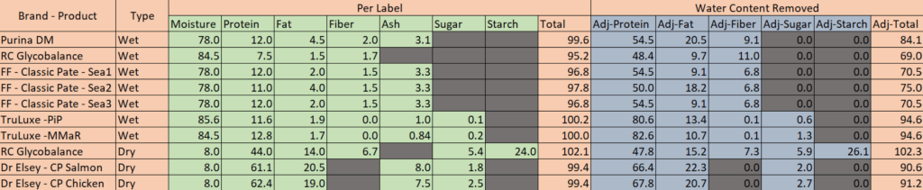 For food types, this was a combination of analysis of ingredients (below), along with feedback from Kit behavior, and research online for quality cat food, tested by third parties. In the data below, you can see the adjusted high protein rate, and relative low sugar, critical to a diabetic diet. These outperformed most prescription diets, and make obtaining the food easier.