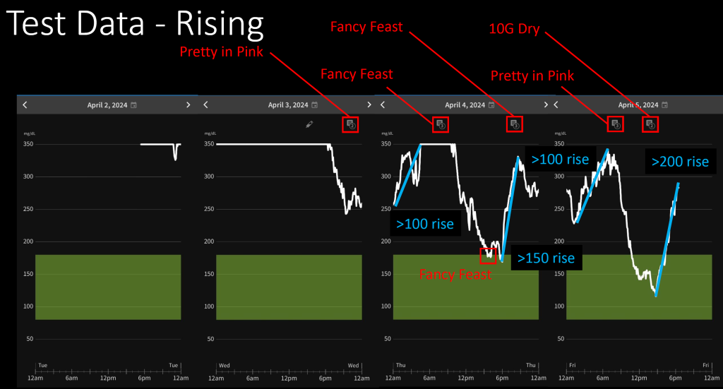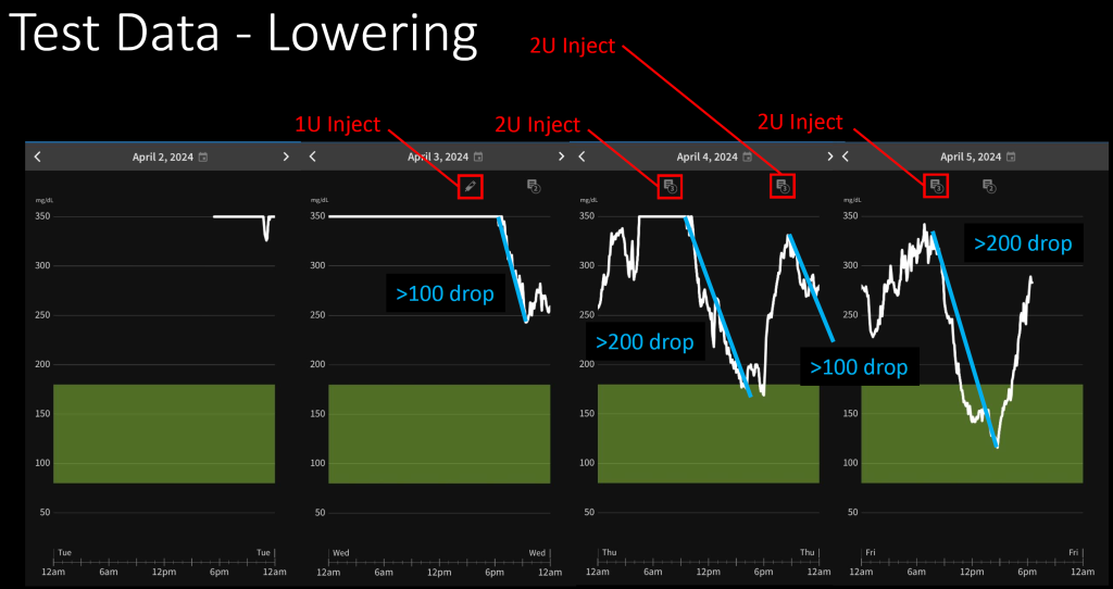 CGM data can easily be seen from a sample of readings on the CGM application, aligned to specific events, where insulin injections lower blood sugar, and food raises. This is a delicate balance, as they have compounding effects, and changing diet means repeated analysis of dose.